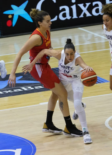A Zamora, dans un Pabellon Municipal Angel NIETO bien rempli pour cette première des 2 confrontations hebdomadaires entre le champion d’Europe en titre et son dauphin, après avoir vu la jeune Alba, 11 ans, faire parvenir le ballon du match sur le parquet (c’est la coutume en Espagne), ce sont les Françaises qui ouvraient le score avec un premier lancer franc de Bria HARTLEY (9 points, 4 passes décisives), suivie de sa capitaine Endéné MIYEM (10 points, 6 rebonds) après un ballon volé par Olivia EPOUPA (0-3, 2′). Profitant de la maladresse espagnole et d’une défense à toute épreuve, les Françaises étaient bien en jambe dans l’entame de match. Quelques instants plus tard, c’était une joueuse bien connue de la LFB, une certaine Queralt CASAS, qui tentait de sonner la révolte mais la réussite mettait du temps à venir pour l’arrière originaire de Catalogne (2-5, 4′). Après avoir subi un nouveau coup de chaud, Lucas MONDELO rappelait ses joueuses (privées d’Alba TORRENS, qui était sur place, et d’Astou NDOUR toujours convalescentes) pour les recadrer. A l’expérience, Laura NICHOLLS (7 points, 11 rebonds) essayaient de relancer la machine mais bien qu’étant pénalisées par une cinquième faute d’équipe au milieu du premier quart-temps, les Bleues ne baissaient pas la garde (3-9, 6′). Si bien qu’alors qu’il restait un peu plus de 3 minutes à jouer dans ce premier acte, Olivia EPOUPA (5 points, 11 rebonds) se chargeait de franchir la barre des 10 points d’avance pour son équipe (3-13, 7′). Ironie du sort, cette barre était notamment effacée non pas par une joueuse confirmée mais par la jeune Paula GINZO (8 points, 2 rebonds) (6-13). A une minute de la fin du premier quart-temps, Magali MENDY (5 points, 2 fautes provoquées) inscrivait son premier panier, qui plus est à 3 points. Et après 10 minutes de jeu et 2 lancers réussis par Valériane VUKOSALJEVIC (4 points, 6 rebonds), les Françaises menaient 13-21.