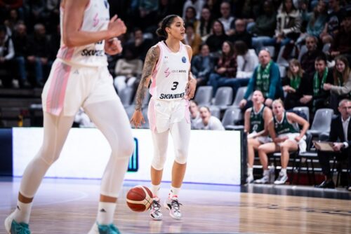 Du côté de la banlieue lilloise, on a assisté à un beau duel franco-français entre Villeneuve d’Ascq et Basket Landes. Comme on pouvait raisonnablement s’y attendre, les deux équipes se sont regardées les yeux dans les yeux dans le premier quart-temps (14-14, 10′). Puis, Angela SALVADORES (11 points, 3 passes décisives) et les Landaises ont semblé plus déterminées à l’approche de la mi-temps et ont regagné les vestiaires avec un léger avantage (27-29, 20′). Celui-ci fut toutefois assez vite balayé (28-14 dans le troisième quart-temps) par les partenaires d’une Aminata GUEYE en très grande forme (13 points à 80% et 4 rebonds) pour permettre aux Nordistes de s’imposer au Palacium.