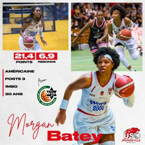 La dernière arrivée annoncée est une belle prise avec le retour de l’Américaine Morgan BATEY sur les terrains français. Elle arrive d’Israël mais avait fait avant celà une très bonne impression offensive et défensive avec La Tronche Meylan pendant 2 ans. Un poste 2/3 qui sera surement la leader offensive avec son shoot mi-distance très très fiable.