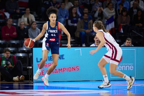 Pour le coup d’envoi, nous avions su que Clarince DJALDI-TABDI et Garance RABOT n’étaient pas actives avec l’Équipe de France, et nous avions 12 Françaises prêtes à ce premier défi face aux Belgian Cats, qui étaient privées de leur duo, Julie VANLOO – Julie ALLEMAND, sur les postes 1 et 2. En effet, les deux joueuses sont sous contrats en WNBA, mais seront bien à l’Eurobasket, contrairement à Kyara LINSKENS qui restera dans la ligue Nord-Américaine. Dès le coup d’envoi, nous avons pu ressentir au niveau du tableau d’affichage que la France était plus avancée au niveau des automatismes et la défense était déjà bien en place du côté des joueuses de Jean-Aimé TOUPANE. Il y avait moins de déchets dans le jeu des partenaires de Marine FAUTHOUX (10 points) et la Belgique commettait beaucoup de « turnovers » avec 12 balles perdues sur la 1ère mi-temps. Les Bleues étaient en confiance au niveau des tirs et nous avions de très solides statistiques à la pause (8 sur 12 à 3 points, 14 sur 15 aux lancers francs). Les 20 premières minutes ont été à sens unique et les coéquipières d’Emma MEESSEMAN (12 points, 3 passes) étaient reléguées à -38 à la pause (54-16). La démonstration des Bleues était totale avec Iliana RUPERT (11 points, 7 rebonds, 3 interceptions) qui était déjà flashée à 16 d’évaluation à la mi-temps. Après la pause fraîcheur et tactique de 15 minutes, les deux nations sont revenues avec plus d’intentions, surtout la Belgique qui avait encaissé un 12-0 en fin de 2ème quart-temps. La France connaissait moins de réussite derrière la ligne à 3 points sur le 3ème quart-temps (0 sur 7), mais Valériane AYAYI (9 points, 1 contre) et les Bleues trouvaient des solutions dans la raquette adverse. La Belgique a réalisé son meilleur quart-temps, d’un point de vue offensif avec 19 points inscrits, mais l’écart continuait de grimper avec un score qui était monté jusqu’à +43 à plusieurs reprises. Après un 3ème quart-temps productif (40 points marqués au global), les deux pays étaient moins réalistes sur le début du 4ème quart-temps, mais c’était une fois de plus la France qui allait mener une série sanglante de 11-0, dont 4 points inscrits par Leila LACAN (14 points, 4 rebonds) qui a fêté ses 21 ans hier. Une de ses prochaines coéquipières à Basket Landes, Becky MASSEY (12 points, 5 rebonds) a arrêté l’hémorragie avec un panier après plus de 7 minutes de disette offensive. La France a relancé le « show » en atteignant la barre des 54 points d’avance (91-37). Sur les dernières possessions de jeu, la Belgique a fini sur un anecdotique 5-0, mais nous avions bien un score final sans appel pour les coéquipières de Pauline ASTIER (9 points, 7 passes) qui rejoueront dès demain soir face à la Belgique. Le match sera cette fois diffusée sur la chaîne l’Equipe.