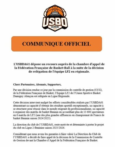 Relégué en Ligue Régionale par la Commission de Contrôle et de Gestion de la FFBB, Alençon a décidé de faire appel. Pour obtenir le droit de rester en Ligue 2, il faudra donc au club apporter des garanties financières à la Chambre d’Appel de la FFBB.