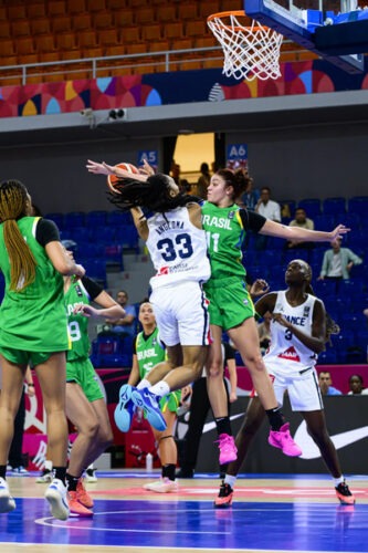 Pour ses débuts, la France défiait le Brésil qui avait dans ses rangs, Ayla MCDOWELL (18 points, 7 rebonds), ayant disputée l’Americup sur le début du mois de juillet. En parlant de démarrage, les joueuses d’Aurélie BONNAN ont été tranchantes sur le 1er quart-temps avec une grosse activité en attaque qui a mis en péril la défense du Brésil qui prenait la foudre sur les attaques rapides des partenaires de Sarah CISSE (11 points, 8 rebonds). Après avoir fait un premier écart sur les 5 premières minutes de jeu (14-6), la France a continué d’appuyer sur le bouton « bucket » pour obtenir un +15 après 10 minutes de jeu (27-12). Le Brésil avait des armes pour essayer de ralentir l’attaque des Bleues, notamment Julia PREIS (8 points, 6 rebonds) qui a marqué son empreinte dans le tournoi en produisant 8 contres sur cette partie. En parallèle de cette défense, nous avons vu une réaction des coéquipières de Raissa LUCAS (6 points, 1 rebond) qui sont revenues à -10 grâce à des tirs lointains réussis notamment (34-24). Après cela, les Françaises ont remis les points sur les « i » avec un 10-0 produit (44-24). A la mi-temps, nous pouvions observer un écart au-delà des 20 points (50-28). La défense des Bleues était féroce dans la peinture et le Brésil n’a rien eu de facile sur la majorité de ses attaques. Avec une adresse plafonnant à 21 %, les Brésiliennes ont connu une 2ème mi-temps difficile avec seulement 19 points marqués. Nell ANGLOMA (21 points, 6 rebonds) a été étincelante en attaque, en dévorant les espaces laissées, et a fini meilleure marqueuse du match. La France a continué à jouer dur en creusant d’avantage l’écart en passant notamment un 15-0 durant le 3ème quart-temps (50-33, 65-33). Sur le 4ème quart-temps, les remplaçantes ont pu avoir plus de minutes et notamment Stella KESSLER (11 points, 4 passes) qui a marqué les 6 derniers points des Bleues.