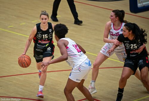 Dès vendredi soir, Namur a confirmé sa bonne forme en ce début d’année civile. En déplacement sur le parquet des Spirou Basket où elles ont d’abord été accrochées (15-22), Wivine DEFOSSET (17 points dont 3/4 à 3 points) et ses partenaires ont pris leur envol dans un deuxième quart-temps à sens unique (7-27). Puis, l’étau s’est de nouveau resserré au retour des vestiaires mais les filles de Laurent FRANCOIS ont maintenu le cap pour s’en aller vers un large succès. Le lendemain, belle empoignade entre Waregem et Donza ! En maîtrisant leur sujet pendant 3 quarts-temps (43-55, 30′) et en s’appuyant sur un trio composé de Kaat PAUWELS (14 points, 4 rebonds) et les soeurs Ella (14 points, 7 rebonds) et Leni DECLERCQ (14 points, 5 rebonds), les pensionnaires de De Pinte ont pris un bel ascendant psychologique. Du coup, quand Aurélie VANDERSTRAETEN (14 points, 6 rebonds) ou encore Eva VAN GILS (14 points, 5 rebonds) ont tenté de redresser les locales en fin de match, c’était peine perdue car le retard accumulé jusque-là était trop conséquent.