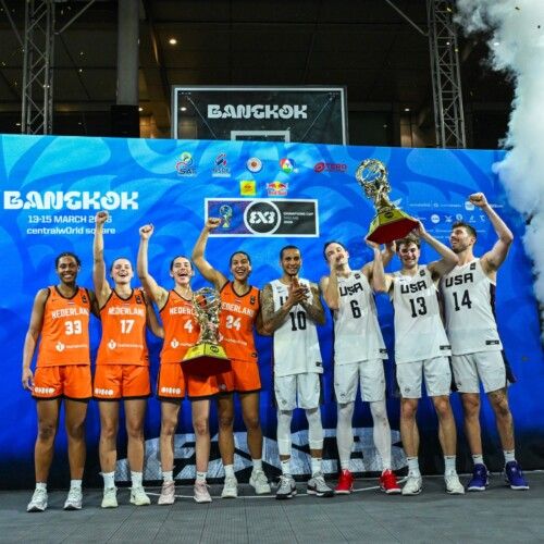 Les Néerlandaises, ici avec les Américains vainqueurs chez les hommes, ont disposé de l’Azerbaïdjan © FIBA 3×3