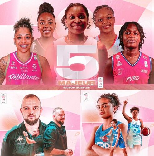 La MVP Manaelle YERBE forcément, est accompagnée par 2 voironnaises qui ont terminé 2nde de saison régulière. Daniela DIBANZILUA (16.8pts à 47.9%, 3 rebonds, 2.3 passes, 3.2 interceptions, 15.3 d’éval), 2ème marqueuse de la division et fer de lance de l’attaque de Voiron. Samantha PEYTOUR (13.8 pts à 60%, 10.3 rebonds, 20.6 d’éval) 2ème évaluation de la division qui a pris de plus en plus de place au fil de la saison dans le collectif isérois. La meilleure passeuse de la division, Lauryn VIEIRA (9.5pts, 3.9 rebonds, 6.3 passes, 13.2 d’éval en 31 minutes) de Reims est aussi au tableau des médailles. La meneuse des Pétillantes a réalisé une première saison professionnelle d’un très bel acabit. Promue avec son équipe, elle a mené le club champenois en playoffs (8è) après avoir longtemps lorgné sur le top5. L’Américaine Rose MICHEAUX (15.6pts à 51.5%, 9.3 rebonds, 17.4 d’éval), de Feytiat, accompagne les 4 françaises au tableau d’honneur. Leader de son équipe aux points, rebonds, et à l’éval, le poste 5 a aider à conduire les Limousines à une belle 4ème place de saison régulière.